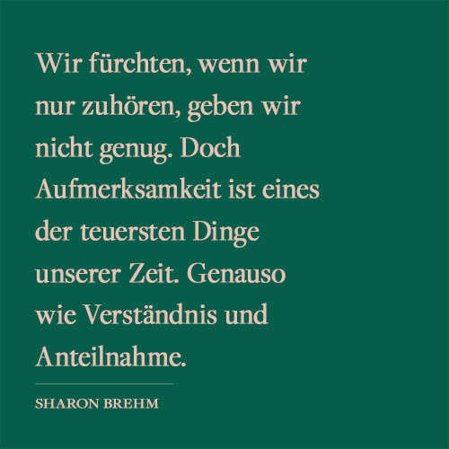 Außerdem unterschätzen viele wie wichtig Zuhören ist. Wir fürchten, wenn wir nur zuhören, geben wir nicht genug. Doch Aufmerksamkeit ist eines der teuersten Dinge unserer Zeit. Genauso wie Verständnis und Anteilnahme.